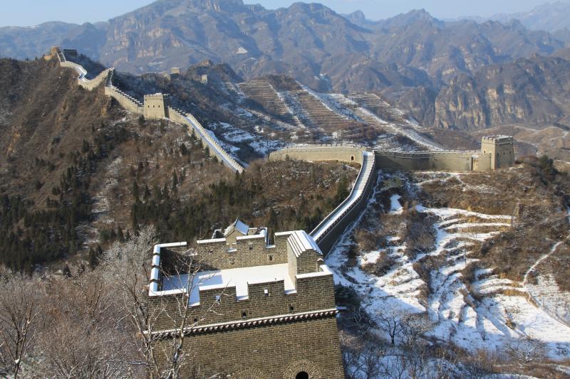 11月7日,位于天津市蓟州区的黄崖关长城迎来降雪,雪后黄崖关长城银装素裹,颇有北国之壮美。